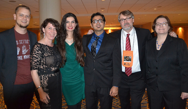 Michael Bailey, Erinn Kemper, Kiran Malik, Usman Malik, Michael Arnzen, and Lucy Snyder at the World Horror Convention/Bram Stoker Awards 2015 in Atlanta. Photo by Ellen Datlow.
