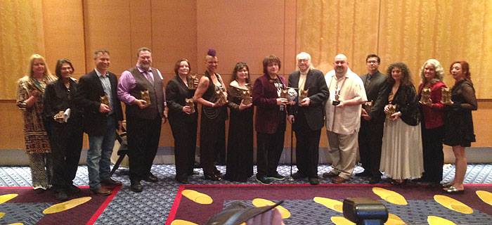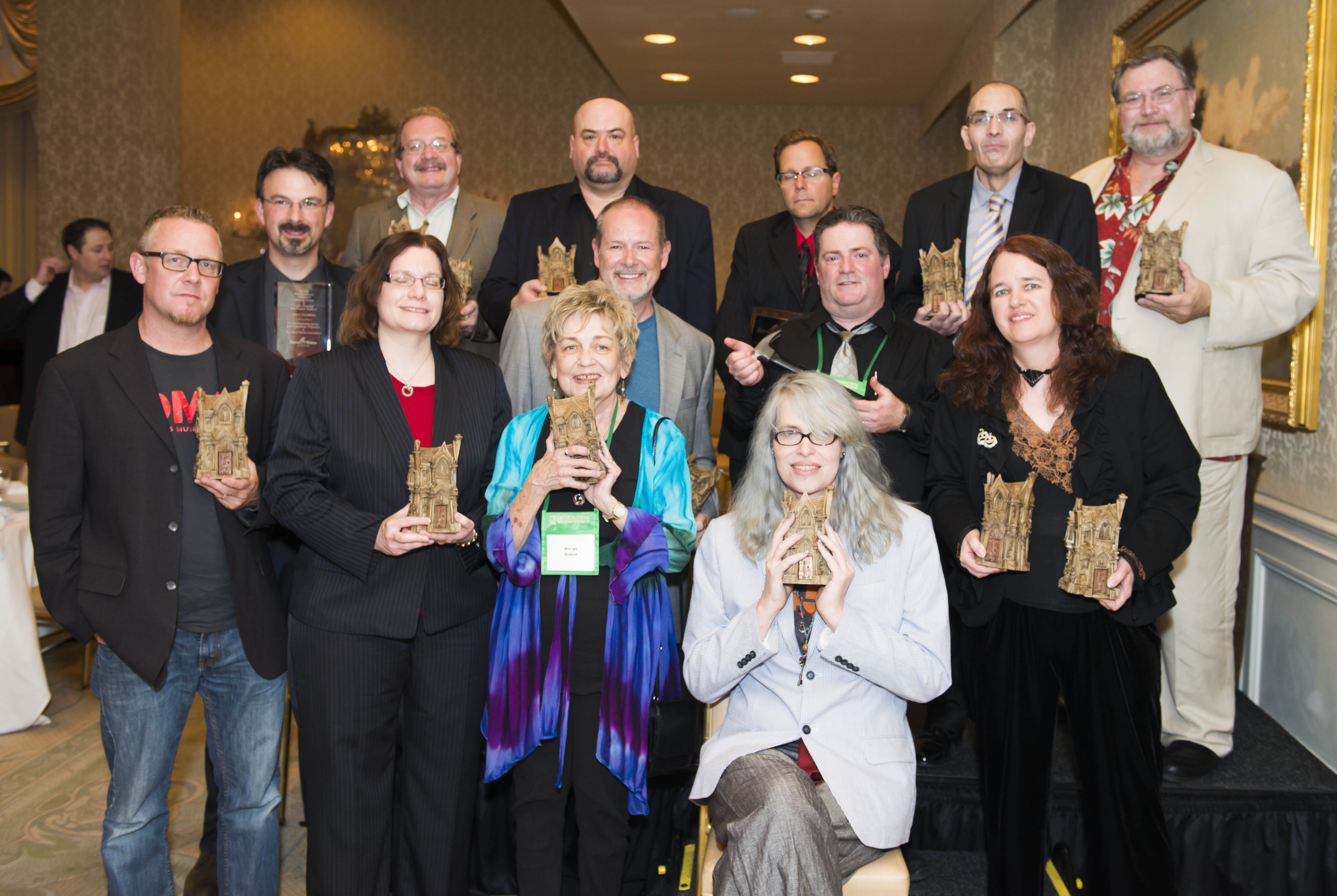 The winners: Danel Olson, Kate Jonez, Thomas Monteleone, Ellen Datlow, Leslie Klinger, Olivia Monteleone, Tom Deady, Maria Alexander, Tim Waggoner, Jennifer Barnes, Dennis Etchison, James Chambers, and Linda Addison. Photo by Dave Duffy.