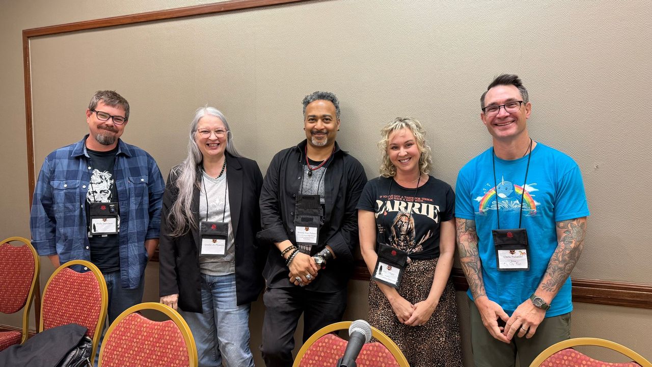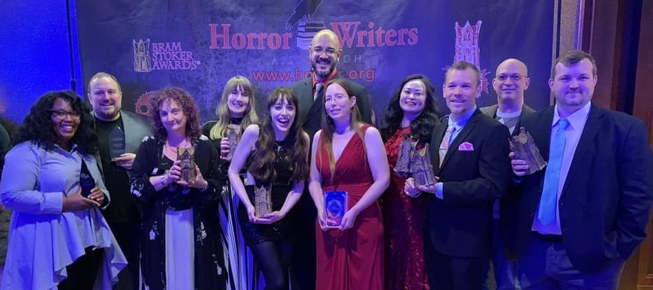 The 2022 Bram Stoker Award winners: (left to right): Michael Knost, Linda Addison (is she accepting for Koji Suzuki?), Angela Yuriko Smith, Geneve Flynn, Hailey Piper, Lee Murray, Mackenzie Kiera, James Flanagan, Jeff Strand, Gemma Files, Kevin J. Wetmore, Jr., Ellen Datlow, Nancy Holder, Sumiko Saulson, Jo Fletcher. (photo by Meghan Arcuri-Moran)Maxwell Ian Gold and Tracy Cross (photo by Ellen Datlow)Sarah Langan and Grady Hendrix (photo by Ellen Datlow)Ellen Datlow and Carol Gyzander (photo by Meghan Arcuri-Moran)Meghan Arcuri-Moran and Brian Keene (photo by Meghan Arcuri-Moran)Linda Addison and Michael BaileyBrian Matthews, James Chambers, and Kevin J. Wetmore, Jr. (photo by Meghan Arcuri-Moran)Rena Mason and Cherry Weiner (photo by Rena Mason)Jonathan Lees (photo by Rena Mason)Back row: Maurice Broaddus, L.H. Moore, Sumiko Saulson, Jamal Hodge, Zin E. Rocklyn, John Edward Lawson, ??? Middle row: Chesya Burke, Linda D. Addison, R.C. Briggs, Lisa Macon Wood, Craig Laurance Gidney, Denise Tapscott, Tracy A. Cross, Marc L Abbott, Sheree Renée Thomas., Danian Darrell Jerry, Don Guillory Front row (kneeling): Kirk Johnson, Steven Van Patten [Photo by Emily L. Flummox et alia]Sephira Giron, Larissa Glasser, Emily Flummox and Sumiko Saulson (photo by Sumiko Saulson)Emily Flummox, Jennifer McMahon, and Sumiko Saulson (photo by Sumiko Saulson)“Horror Noir-The influence of Black Americans in Horror” panel with Marc L. Abbott, Sheree Renee Thomas, Linda Addison, Chesya Burke, and John Edward Lawson. (Photo by Denise Tapscott)“Horror that Hits Close to Home-Bringing Personal Experience to Your Writing” panel with Lisa Marie Wood, Heather Graham, Kate Maruyama, Tracy Cross, and Sarah Langan. (Photo by Denise Tapscott)“Finding Your Scooby Gang- Building a Network and Professional Relationships in Horror Writing” panel with Thom Mavroudis, Jeff Strand, Tom Deady, Tori Eldridge, Sumiko Saulson, and Michelle Renee Lane. (Photo by Denise Tapscott)