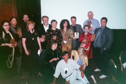 The winners: Roy Robbins, Rocky Wood, Joe Lansdale, Rick Hautala, Karen Lansdale, Robert R. McCammon, Linda Addison, John Skipp, Nancy Holder, Guy Anthony De Marco, and Joe McKinney. Photo by Lisa Morton.