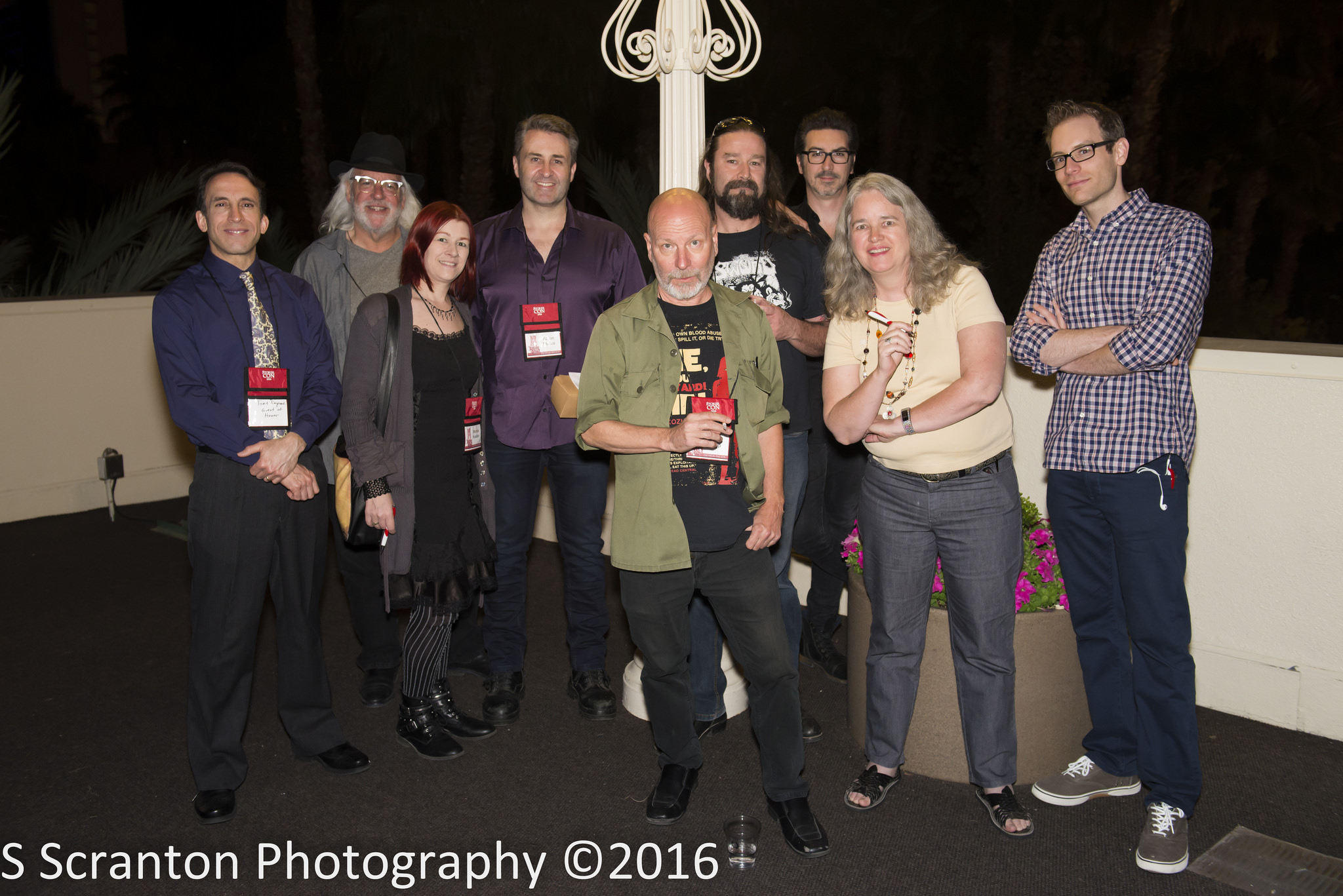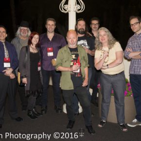 The judges for the Final Frame Short Horror Film Competition: Tony Timpone, Daniel Knauf, Monica Kuebler, Aaron Sterns, John Skipp, Mike McCarty, Ryan Turek, Lisa Morton, and Mark Miller. Photo by Seth Scranton.