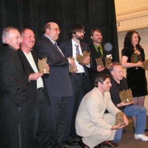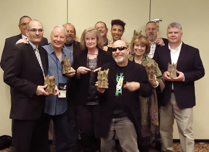 The winners: Standing: Thomas Monteleone, David Morrell, Peter Straub, Joe Hill, Michael Arnzen, Lisa Morton. Kneeling: Hank Schwaeble, Stephen Jones