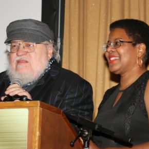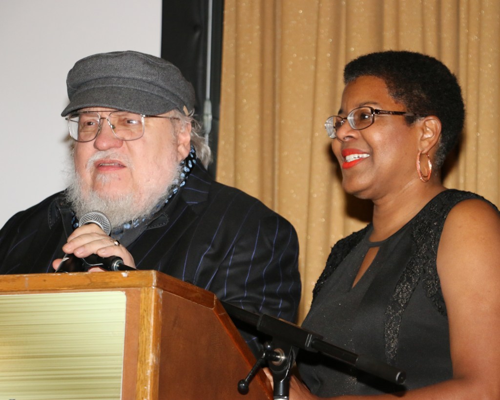George R. R. Martin and Tananarive Due present the Novel award. Photo by Robin Reed.