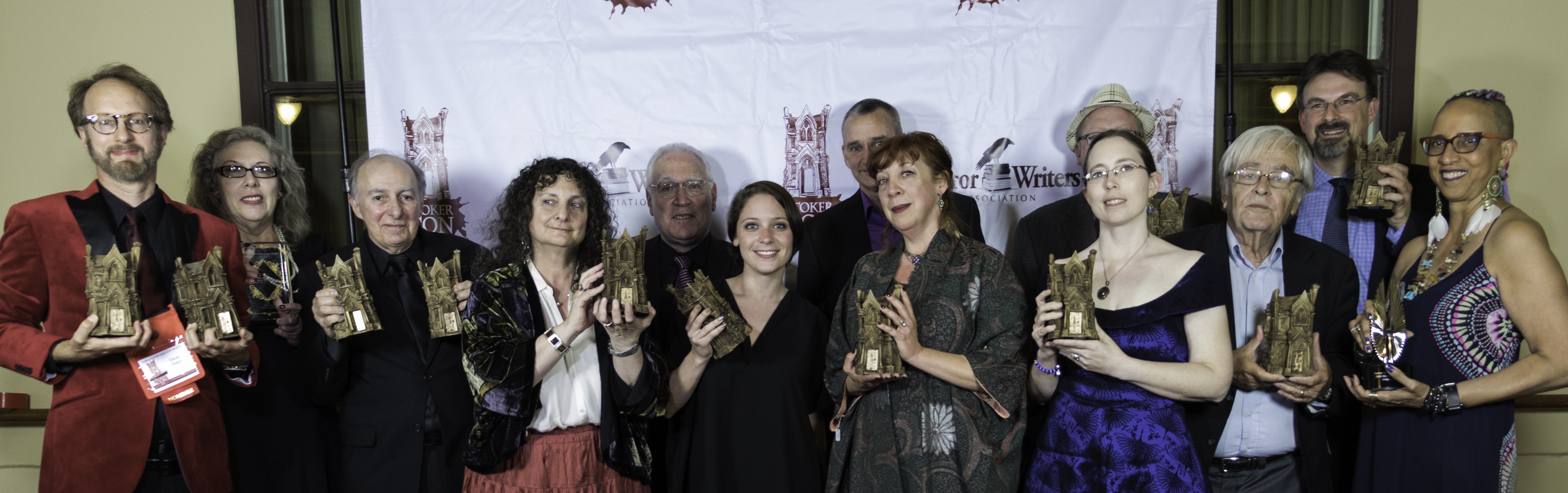 2015 Bram Stoker Award winners: Mandy Slater (accepting on behalf of Tanith Lee), Jack Ketchum, John Dixon, Jonathan Maberry, Lucy A. Snyder, Linda D Addison, Rena Mason, Jason V Brock, William F. Nolan, Michael Knost, Usman Tanveer Malik, Ellen Datlow, Lisa Morton, Maria Alexander. Photo by John Palisano.