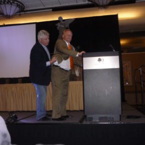 Mort Castle presents the Non-fiction award to Rocky Wood. Photo by Lisa Morton.