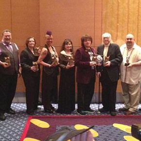 The winners: (standing) Paula Guran, Neil Gaiman, Beth Gwinn, John Farris, Stanley Wiater, Linda Addison. (Kneeling) Brian Keene, Tim Lebbon. Photo by Monica O’Rourke.