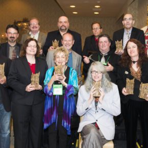 From left to right: Final Frame Film Competition Kenikki Jones, Richard Laymon President’s Award winner Brad Hodson, Anthology award winner Ellen Datlow, Poetry winner Sara Tantlinger, First Novel winner Gwendolyn Kiste, Specialty Press Award winners John Edward Lawson and Jennifer Barnes, Long Fiction winner Rena Mason, Fiction Collection winner Eric J. Guignard, Mentor of the Year Award winner JG Faherty, and Non-fiction co-winner Eugene Johnson. (Photo by Lynne Hansen)