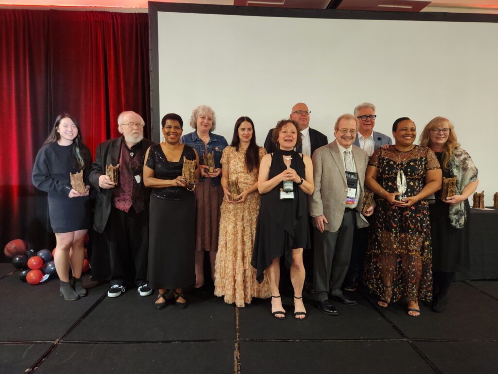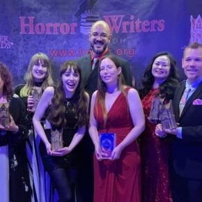The Bram Stoker Award winners: Elizabeth Massie (accepting for Linda Mannetti), Doug Murano, Kim Liggett, Grady Hendrix, Angel Leigh McCoy, Linda Addison, Rose O’Keefe, Jeff Strand, Christopher Golden, and Stephanie M. Wytovich. Kneeling: Paul Tremblay (accepting for Stephen Graham Jones) and Michael Bailey (accepting for Alessandro Manzetti). Photo by Lisa Morton